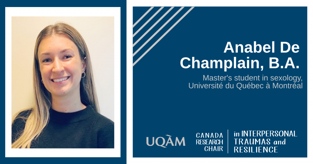 Enthusiastic about the idea of being part of the Canada Research Chair in Interpersonal Trauma and Resilisence, Anabel feels that her involvement within the Lab will support her learning objectives and that Dr. Hébert’s expertise will be of great assistance in the completion of her master’s thesis.