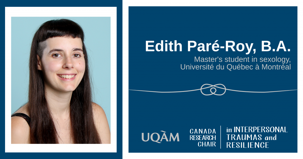 Edith’s research interests arose while exploring the themes of trauma and resilience through creative writing. She has written articles on a variety of gender issues for the organization Les 3 sex. While writing an article about the Youths’ Romantic Relationships (YRR) survey, a project led by Martine Hébert, her interest in resilience was reinforced. She then decided to pursue a master’s degree in sexology under the direction of Dr. Hebert.