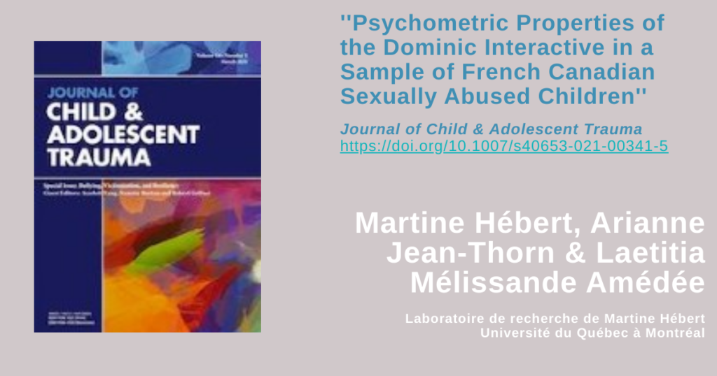 Un article rédigé par Martine Hébert, directrice du laboratoire, Arianne Jean-Thorn et Laetitia Mélissande Amédée, étudiantes du laboratoire, est récemment paru dans le Journal of Child & Adolescent Trauma.
