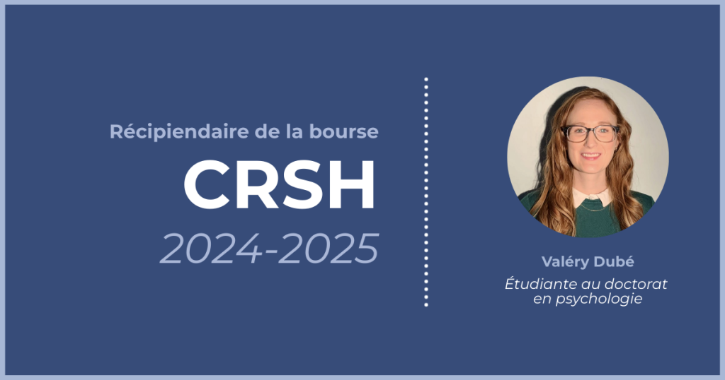 Nous tenons à féliciter Valéry Dubé, membre du laboratoire et étudiante au doctorat au psychologie, pour l’obtention de la bourse de doctorat du Conseil de recherche en sciences humaines (CRSH) du concours 2024-2025.