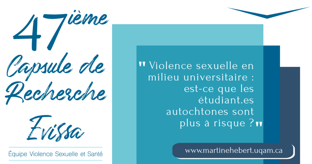 Capsule de recherche ÉVISSA (#47) Une nouvelle capsule de recherche ÉVISSA est disponible ! Cette étude visait à mieux comprendre la violence sexuelle subie en milieu universitaire chez les autochtones. Pour consulter la capsule, cliquer ici.
