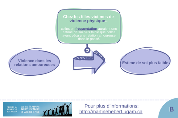 Une relation existerait entre la violence subie dans les relations amoureuses et l’estime de soi à l’adolescence. Cette relation peut varier selon la forme de violence subie, le sexe et le statut relationnel des adolescent.es victimes, soit trois facteurs à prendre en considération lors des interventions.