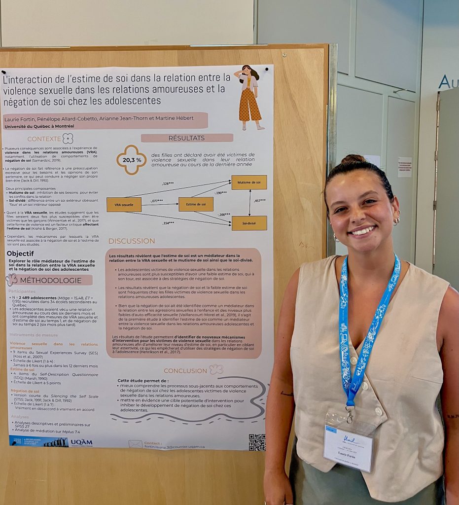 Parmi ces membres, Laurie Fortin, étudiante au doctorat en psychologie, a présenté une étude concernant l’interaction de l’estime de soi dans la relation entre la violence sexuelle dans les relations amoureuses et la négation de soi chez les adolescentes.