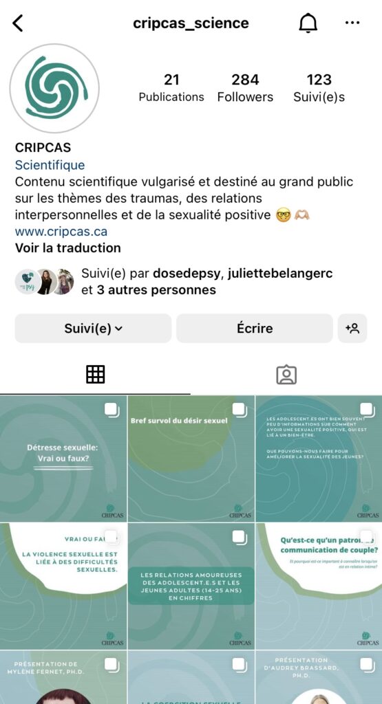 Dirigé par Justine Caouette, doctorante en psychologie au laboratoire de recherche, ce projet vise essentiellement la création et la diffusion de contenus scientifiques vulgarisés et destinés au grand public sur les thèmes des traumas, des relations interpersonnelles et de la sexualité positive. Vous y trouverez entre autres plusieurs résultats de recherche de notre directrice, Martine Hébert et ceux de certain.es de ses collègues membres du CRIPCAS.