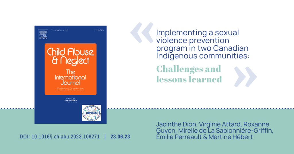 Un article rédigé par Jacinthe Dion, Virginie Attard, Roxanne Guyon, Mirelle de La Sablonnière-Griffin, Émilie Perreault et Martine Hébert, directrice du laboratoire, a récemment été publié dans le journal Child Abuse & Neglect.