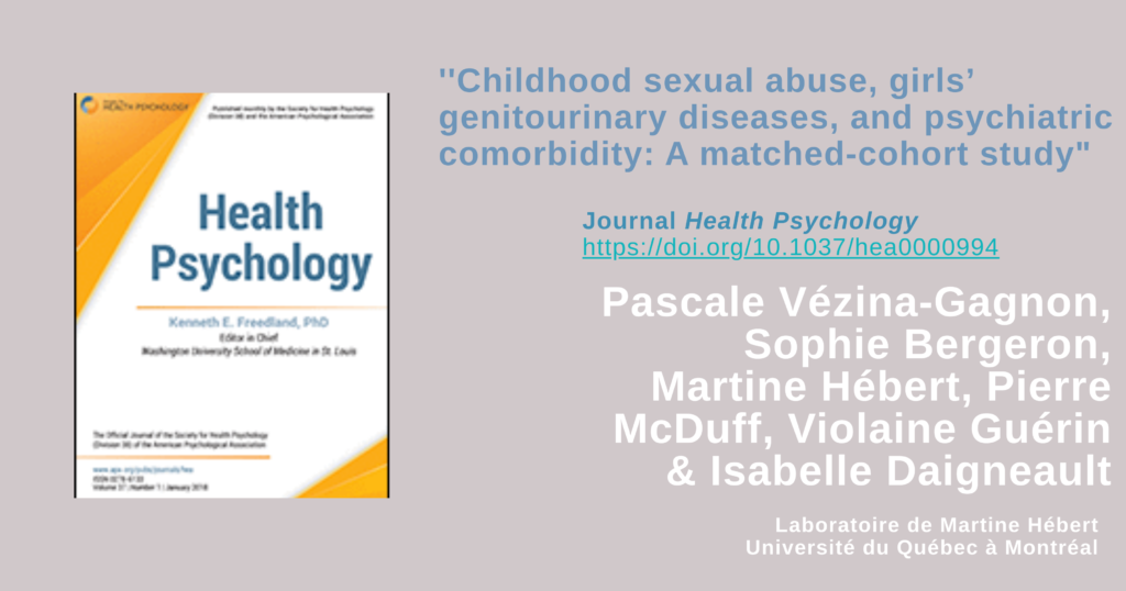 Un nouvel article rédigé par Pascale Vézina-Gagnon, Sophie Bergeron, Martine Hébert, directrice du laboratoire, Pierre McDuff, Violaine Guérin et Isabelle Daigneault est récemment paru dans la revue Health Psychology.
