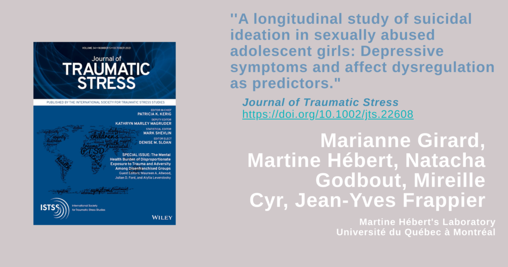 Un nouvel article rédigé par Marianne Girard, Martine Hébert, directrice du laboratoire, Natacha Godbout, Mireille Cyr et Jean-Yves Frappier est récemment paru dans la revue Journal of Traumatic Stress.