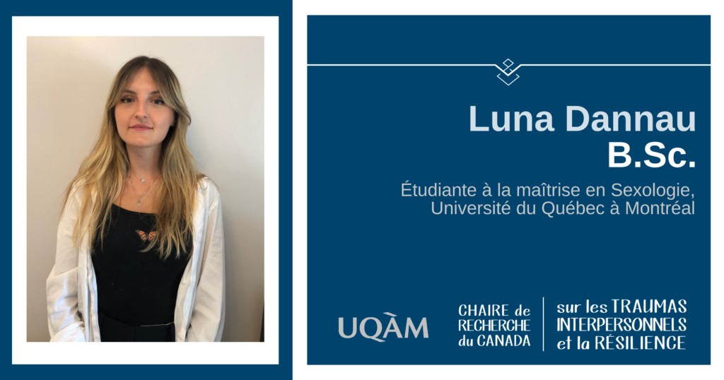 Luna éprouve un réel souci pour la protection de la jeunesse en matière d’agression sexuelle, ce pour quoi elle désire s’engager dans une meilleure compréhension des facteurs de protection de la victimisation sexuelle. Son admiration pour les travaux de Martine Hébert, Ph.D, sur les différentes trajectoires des enfants victimes d’agression sexuelle l’a poussé à vouloir s’impliquer dans son laboratoire.