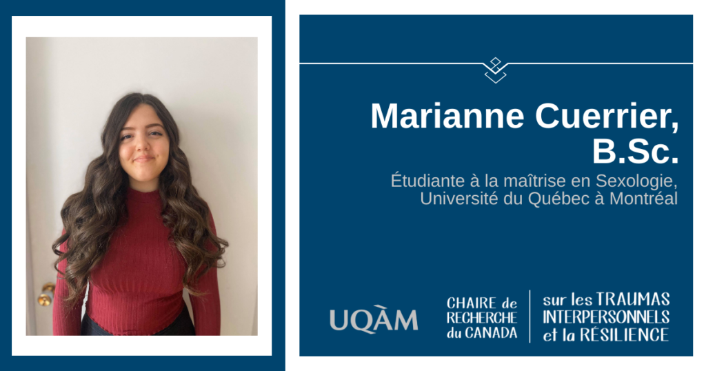 Dans le cadre de sa maîtrise, Marianne s’intéresse à l’assertivité sexuelle comme facteur de risque de la coercition sexuelle dans les relations amoureuses ainsi qu’aux conséquences de la coercition sexuelle sur le désir sexuel. Marianne réalisera sa maîtrise sous la codirection de Dre Martine Hébert et de Dre Mylène Fernet. Elle mentionne avoir beaucoup d’admiration pour Dre Hébert, notamment en raison de ses nombreux prix, ses publications et son implication dans le domaine académique afin de réduire les violences subies par les jeunes. Marianne est enthousiaste d’être codirigée par ces deux chercheuses qui sont des femmes fortes et inspirantes, ce qui l’incite à toujours se pousser plus loin.