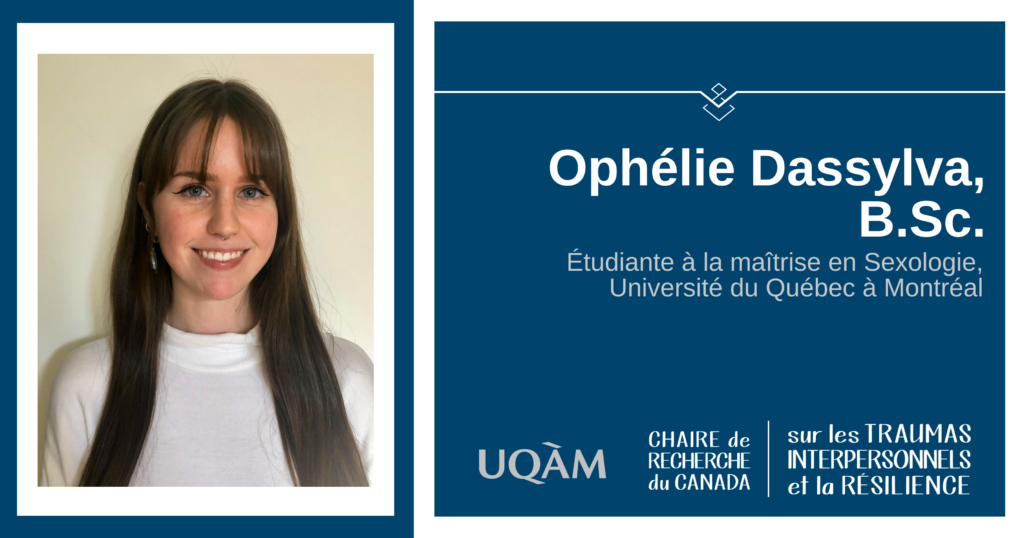 Ophélie a de l’admiration pour les travaux et les réalisations de Dre Hébert et des membres de son laboratoire, notamment en raison du haut niveau de publications, des nombreux prix obtenus ainsi que de la pertinence de leurs recherches pour les enjeux reliés aux agressions sexuelles et à la violence dans les relations amoureuses. Dans le cadre de sa maîtrise, Ophélie s’intéresse aux stratégies de régulation émotionnelle et de coping chez les enfants victimes d’agression sexuelle.