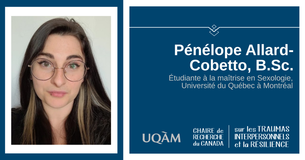 La victimologie est un sujet qui passionne Pénélope depuis le début de ses études universitaires. Sur le plan de l’intervention, elle a travaillé auprès des victimes de violence conjugale et intrafamiliale. Pénélope participe également aux divers projets de la Chaire de recherche du Canada sur les traumas interpersonnels et la résilience, dont le projet Étincelles. De plus, celle-ci fait partie de la Chaire de recherche sur le genre et l’intervention en dépendance de l’Université de Sherbrooke, en tant qu’auxiliaire de recherche.