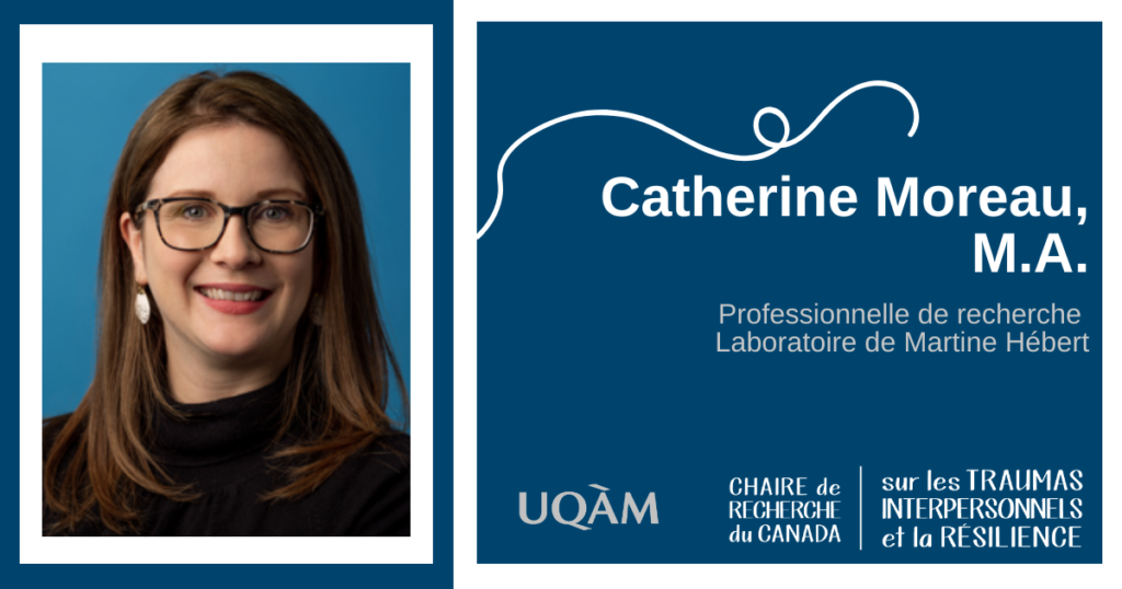 Catherine Moreau détient un baccalauréat et une maîtrise en sexologie de l’UQAM. Depuis 2011, elle est impliquée dans les projets du Laboratoire de recherche de Martine Hébert. En tant que professionnelle de recherche, elle coordonne actuellement le projet Étincelles – un programme de promotion des relations positives et de prévention de la violence dans les relations amoureuses et intimes des jeunes. Elle a également coordonné l’enquête Parcours amoureux des jeunes (PAJ), qui a entre autres permis d’établir un portrait de la victimisation en contexte amoureux auprès d’un échantillon représentatif de jeunes québécois. Elle contribue aux diverses activités de la Chaire de recherche du Canada sur les traumas interpersonnels et la résilience, notamment en ce qui a trait à la gestion administrative des projets, la rédaction de demandes de subvention et de rapports ainsi qu’au transfert des connaissances (ex. soutien à la rédaction d’articles scientifiques, développement d’outils de vulgarisation scientifique). Elle agit aussi à titre de directrice de la rédaction de la Revue internationale de la résilience des enfants et des adolescents, dont Martine Hébert est la rédactrice en chef.