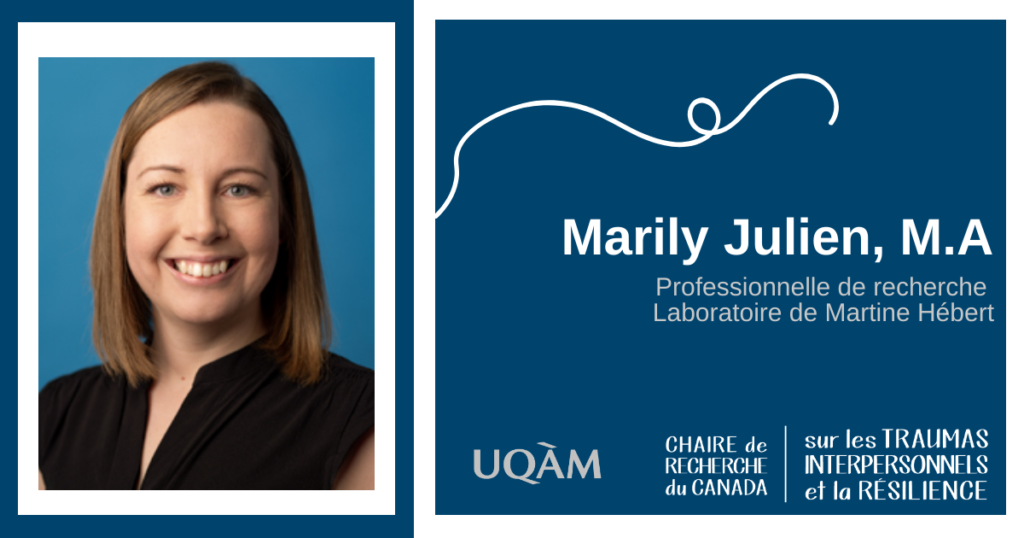 Elle a choisi de travailler au sein du laboratoire de recherche de Martine Hébert afin d’avoir l’opportunité de jumeler ses intérêts en prévention et en recherche, mais également pour la rigueur professionnelle et l’esprit de collaboration qui règnent au sein de l’équipe.