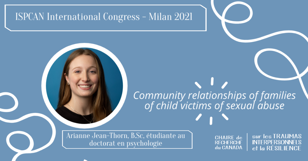 Dans le cadre du Congrès international de l’IPSCAN 2021 de Milan, Arianne Jean-Thorn, étudiante au doctorat en psychologie, a eu l’opportunité de présenter une communication orale sur ses travaux de recherche, intitulée « Community relationships of families of child victims of sexual».