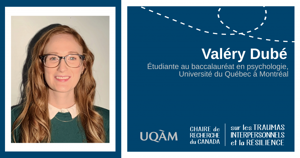 Valéry est étudiante au baccalauréat en psychologie à l’Université du Québec à Montréal. Elle réalise présentement une thèse de spécialisation sous la direction de Martine Hébert, Ph.D. et Louise Cossette, Ph.D. Elle s’intéresse aux répercussions des traumas, tels la négligence, l’abus physique et l’agression sexuelle chez les enfants. Sa thèse portera sur la reconnaissance émotionnelle des enfants victimes d’agression sexuelles qui ont été témoins de violence conjugale.